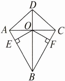 4. 我们把两组邻边相等的四边形叫作“筝形”,如图,四边形ABCD是一个筝形,其中AB = CB,AD = CD,对角线AC,BD相交于点O,OE⊥AB,OF⊥CB,垂足分别是E,F。求证OE = OF。