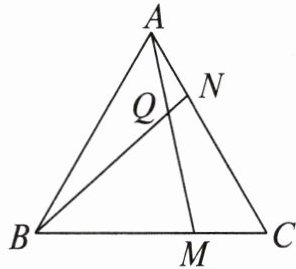 6. 如图,△ABC 为等边三角形,M 是线段 BC 上的任意一点,N 是线段 CA 上的任意一点,且 BM= CN,BN 与 AM 交于点 Q。