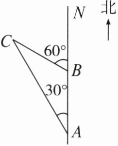5. 上午 $8$ 时,一条船从海岛 $A$ 出发,以 $15$ 海里/时的速度向正北航行,上午 $10$ 时到达海岛 $B$ 处,从 $A$,$B$ 望灯塔 $C$,测得 $\angle NAC = 30^{\circ}$,$\angle NBC = 60^{\circ}$。