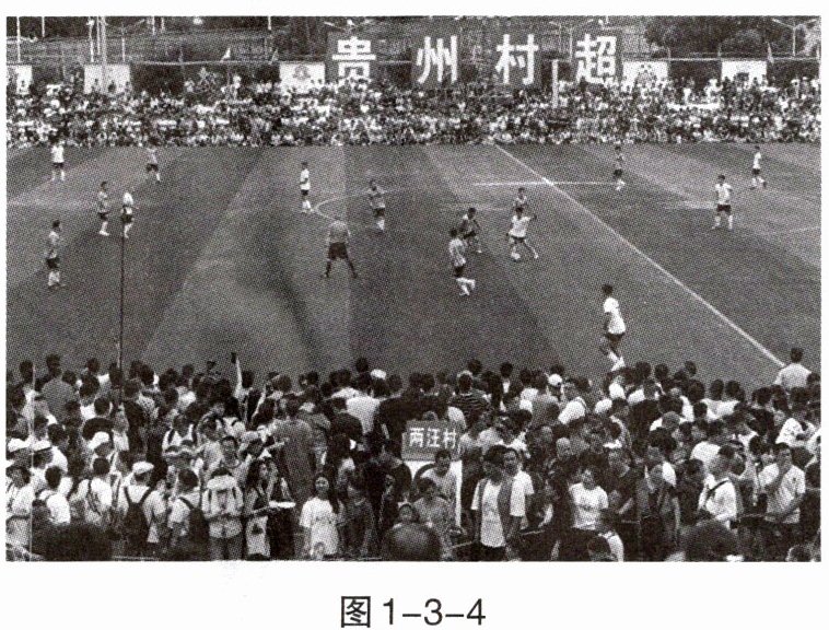 “村超”是贵州榕江县(三宝侗寨)和美乡村足球超级联赛,它以独特的乡土味火爆全网,火出了国门。榕江的“村超”演变成了各民族大交往、大交流、大交融、大团结的大舞台,成为促进民族团结、民族交融的盛会。读图1-3-4“‘村超’景观图”,完成9~10题。