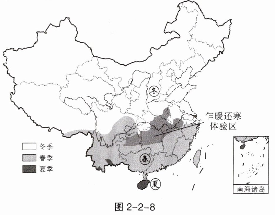 (2024·四川成都)2024 年 3 月初,我国南方大部分地区已进入气象学意义上的春天,但部分地区仍乍暖还寒,体感上依旧寒冷。图 2 - 2 - 8 示意 3 月 6 日全国入春进程。据此完成 1~3 题。