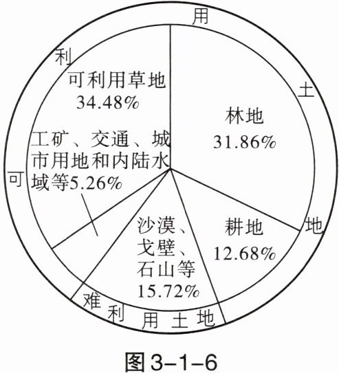 14. 读图 3 - 1 - 6“中国土地利用类型的构成图”,完成下列各题。