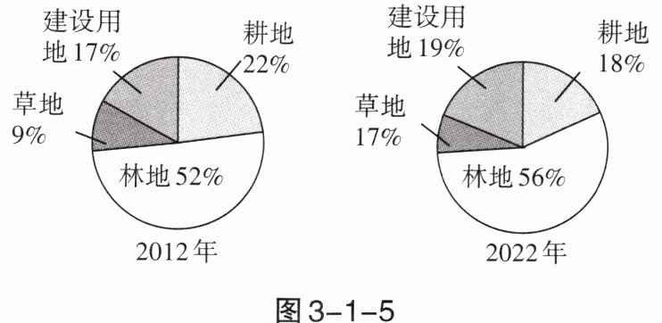 2023 年 6 月 25 日是第 33 个全国“土地日”,主题是“节约集约用地,严守耕地红线”。图 3 - 1 - 5 示意我国某市 2012 年和 2022 年的土地利用类型统计图。据此完成 12~13 题。