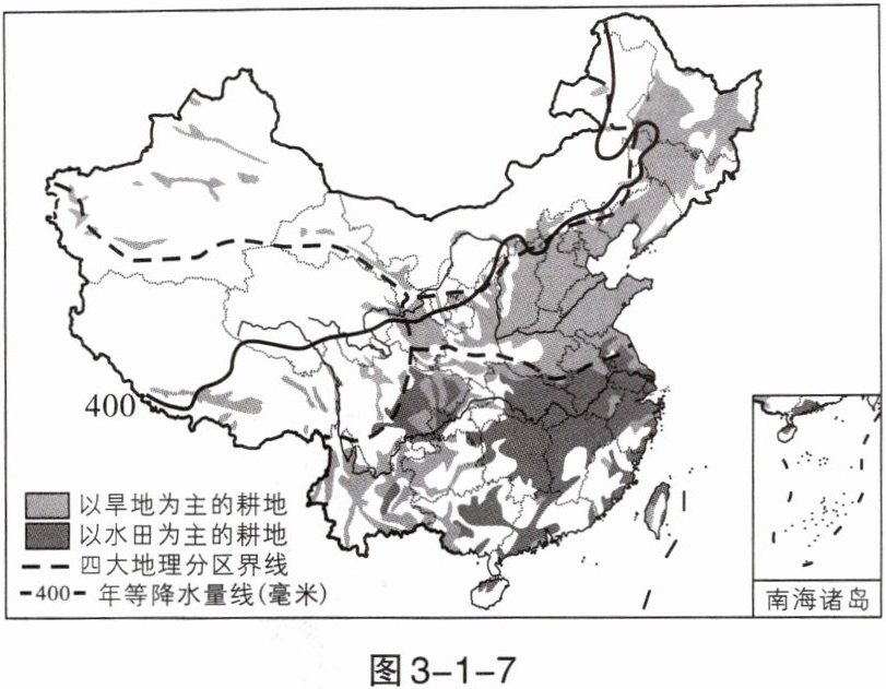 (2023·辽宁)耕地为粮食生产提供空间,保护耕地尤为重要。读图 3 - 1 - 7“中国耕地分布图”,完成下列各题。