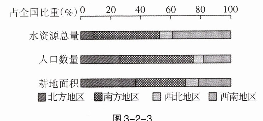 我国是一个水土资源相对短缺且空间匹配欠佳的国家,二十四节气农事歌中说“春雨贵如油”。读图 3-2-3“我国水资源、人口、耕地区域比重图”,完成 6~7 题。