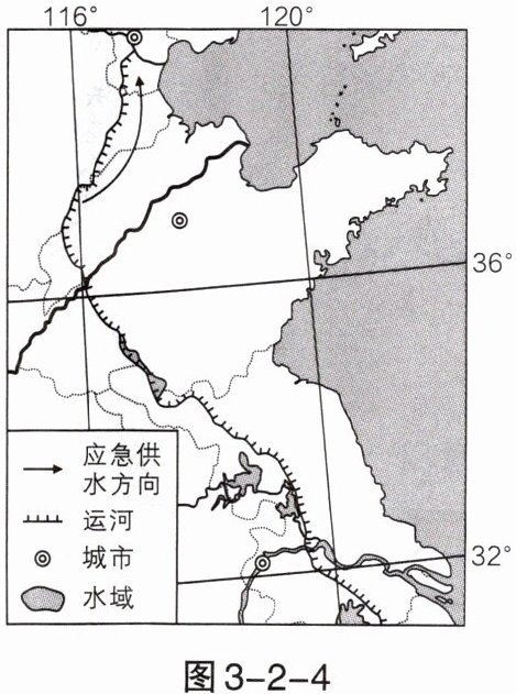 2021 年某日,位于山东省武城县的六五河节制闸开启,南水北调东线一期北延应急供水工程正式向河北、天津供水。读图 3-2-4“南水北调局部示意图”,完成 8~9 题。
