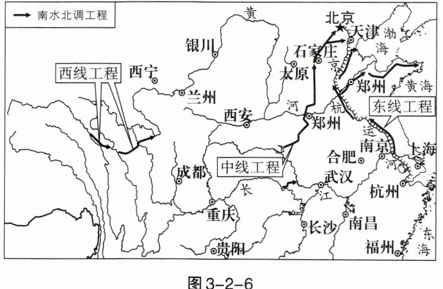 14. 南水北调工程是迄今为止人类历史上最大的调水工程,该工程缓解了华北地区沿线城市用水短缺的状况,提升了居民用水品质,是一条“生命之渠”。读图 3-2-6“南水北调工程线路示意图”,完成下列各题。