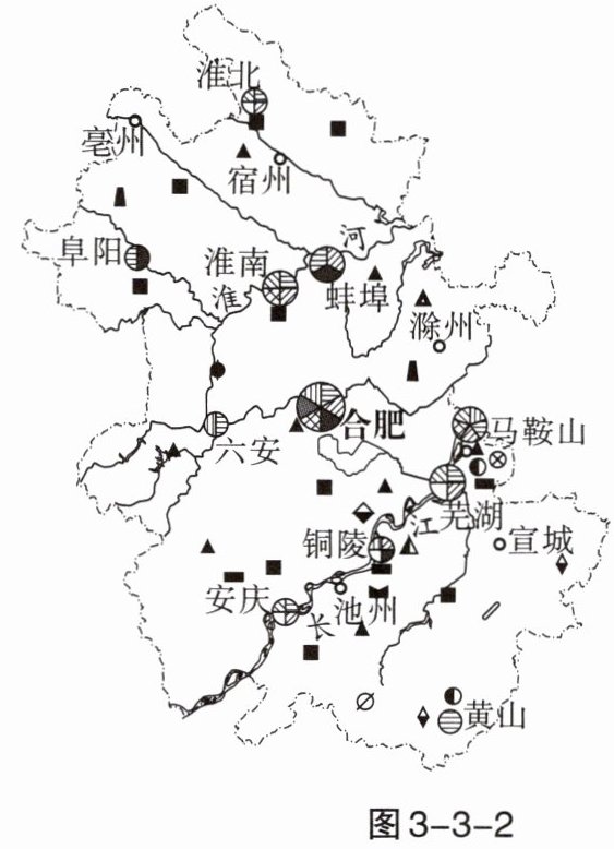 安徽省矿产资源种类多,储量大,多种矿产储量居全国前列。图3-3-2为“安徽省矿产资源分布图”。读图,完成3~4题。