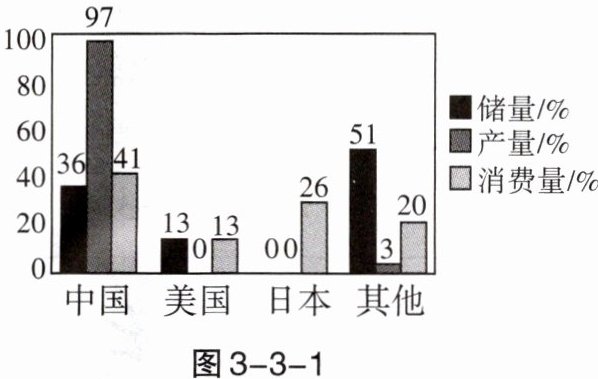 稀土是重要的战略资源,被誉为“工业维生素”,广泛运用于新能源、新材料、电子信息、航空航天等领域。图3-3-1是目前部分国家和地区稀土储量、产量和消费量占世界百分比统计图。据此完成1~2题。