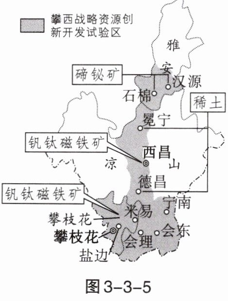 四川攀(枝花)西(昌)地处长江上游川、滇、黔三省接合部,是我国钒钛磁铁矿、稀土、碲铋矿等战略资源富集区。其中,钒钛磁铁矿资源占全国52%、世界11.6%,四川省建立攀西战略资源创新开发试验区。这是目前国家批准设立的唯一资源开发综合利用试验区。读图3-3-5“攀西战略资源创新开发试验区”,完成11~12题。