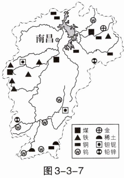 (2023·江西,有改动)江西省矿产资源丰富。其西部地区曾经是浙江、上海等地的能源输出基地,近年来该地区煤炭开采量下降,工业发展面临挑战和机遇。图3-3-7示意“江西省主要矿产分布”,据此完成1~3题。