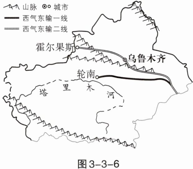 13. “西气东输”工程是我国资源跨区域调配工程之一,可以促进我国能源结构和产业结构调整,带动东部、中部、西部地区经济共同发展,改善管道沿线地区人民生活质量,有效治理大气污染。读图3-3-6“西气东输线路图”,完成下列各题。