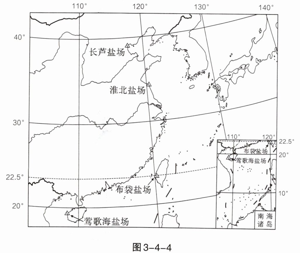 海盐是海洋对人类的馈赠,主要是在盐田通过日晒获得。盐场一般建在气温高、日照强、降水少、蒸发量大的沿海滩涂地区。读图 3-4-4“我国部分地区盐场分布”,完成 10~11 题。