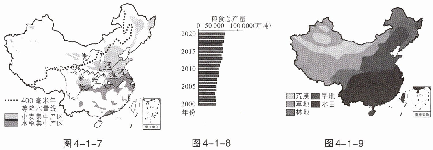 13. 无农不稳,无粮自乱,农业是国民经济建设和发展的基础产业,是我们的衣食之源、生存之本。读图 4 - 1 - 7“我国水稻、小麦集中产区分布图”、图 4 - 1 - 8“我国 2000—2020 年粮食总产量变化统计图”、图 4 - 1 - 9“我国主要土地利用类型分布图”,完成下列各题。