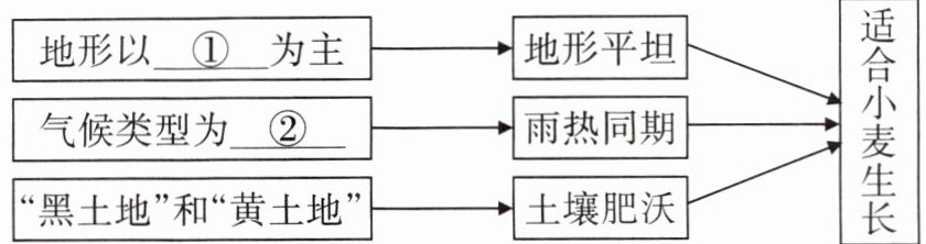 (2)根据所学知识,按照下列框图提示,将小麦集中产区的主要自然条件补充完整。