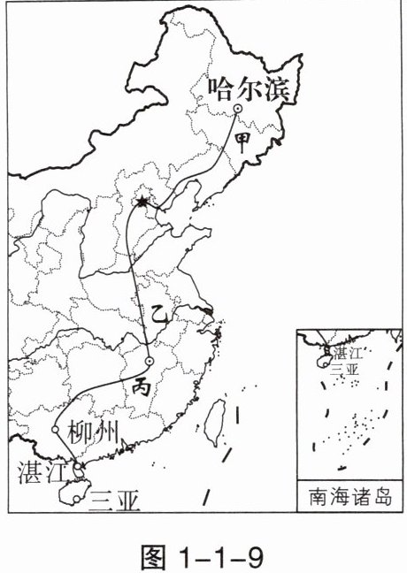 (2024·江苏南京)搭乘“越冬专列”到南方过冬成为新潮。该专列从哈尔滨出发,一路南下,直达海南省三亚市。图 1 - 1 - 9 示意专列路线,读图完成下列各题。