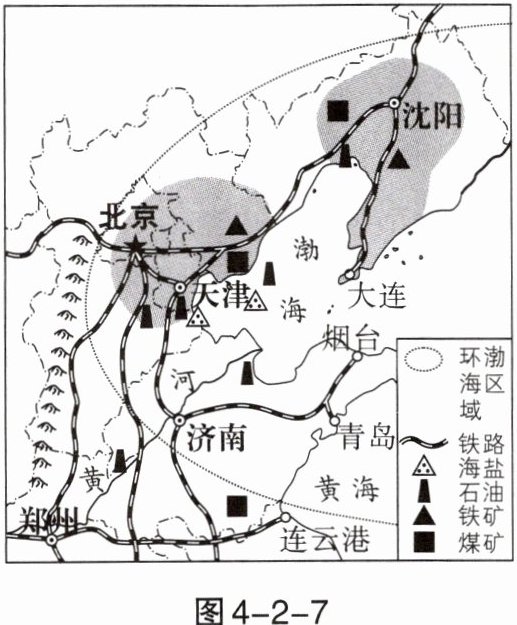 (2024·海南)“环渤海”经济圈带动我国北方地区经济迅速发展。读图 4-2-7“中国‘环渤海’经济圈位置示意图”,完成 1~2 题。