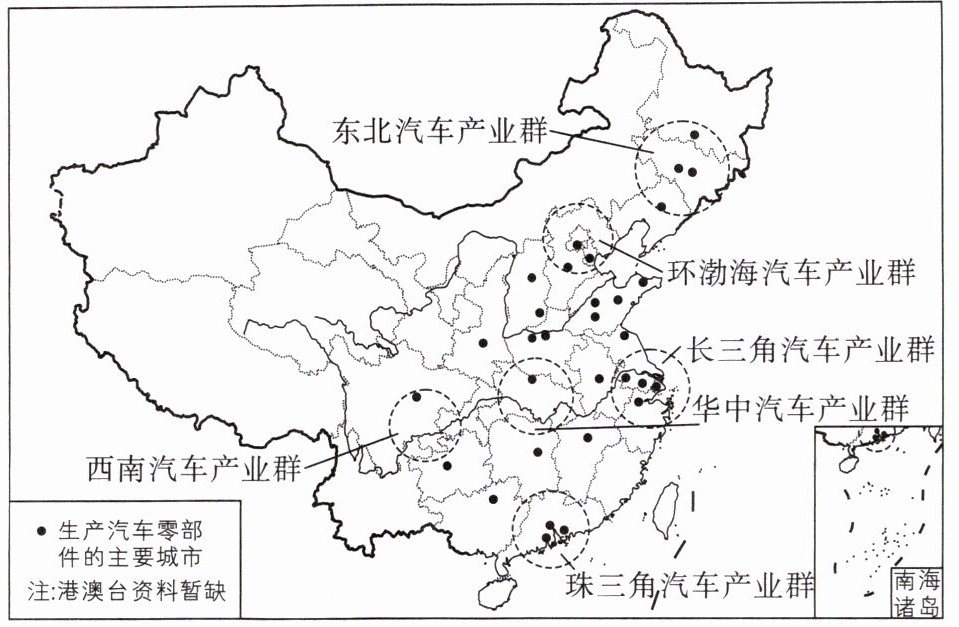 (2024·辽宁)汽车产业是体现国家制造业实力的重要标志之一。中国已形成多个汽车产业群。读图 4-2-8“中国生产汽车零部件的主要城市分布图”,完成 3~4 题。