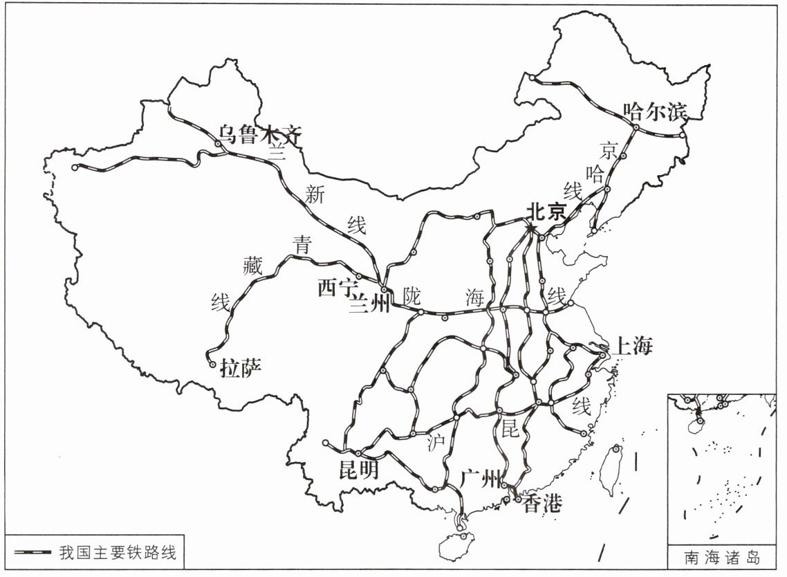 随着铁路建设不断推进,我国铁路网越织越密,如同一条条蜿蜒的巨龙,纵横交错,编织成了一张覆盖全国的网络。读图 4 - 3 - 1“我国主要铁路分布图”,完成 1~2 题。