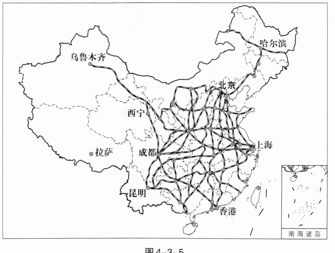 14. 截至 2023 年 3 月,中国高铁运营总里程已逾 4.2 万千米,稳居世界首位。高速铁路助力了我国经济的腾飞,也逐渐成为广大旅客出行的首选交通方式。读图 4 - 3 - 5“中国高速铁路分布示意图”,完成下列各题。