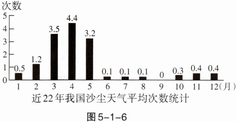 (2023·重庆)我国今年已发生多次大范围沙尘天气,风沙危害严重。读图 5-1-6“近 22 年我国沙尘天气平均次数统计”,完成 3~5 题。