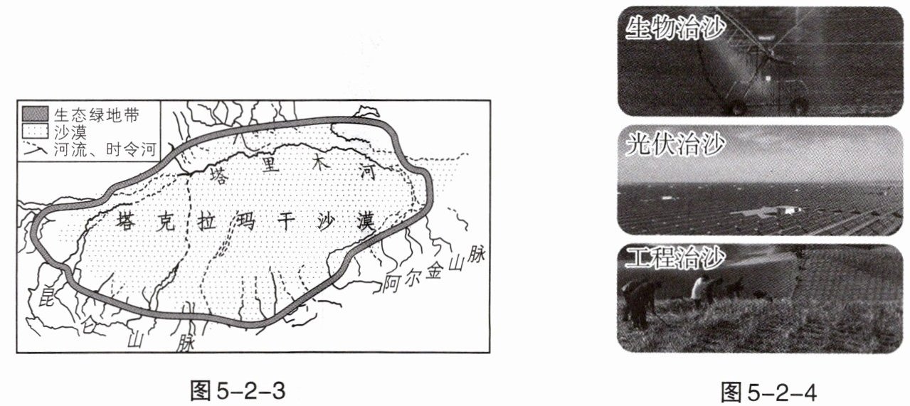 2024 年 11 月 28 日上午,在塔克拉玛干沙漠南缘的新疆于田县,随着最后宽 50 米、长 100 米沙地栽上胡杨、梭梭、红柳等固沙苗木,环绕塔克拉玛干沙漠边缘全长 3 046 公里的绿色阻沙防护带实现全面锁边“合龙”。读图 5-2-3“塔克拉玛干沙漠生态绿环示意图”和图 5-2-4“‘锁死’沙漠‘三件套’”,完成 6~7 题。