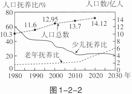 人口抚养比是指非劳动年龄人口数与劳动年龄(15 岁~64 岁)人口数之比。读图 1-2-2“1980 年至 2030 年我国人口总数、人口抚养比变化趋势图”,完成 4~6 题。