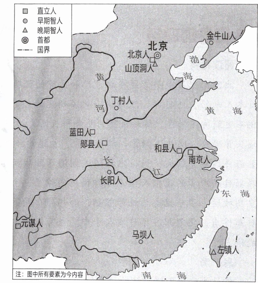 (1)观察《中国主要古人类遗址分布图》,列举我国境内直立人、早期智人、晚期智人化石遗址各1例,概括我国主要古人类遗址分布的特点。