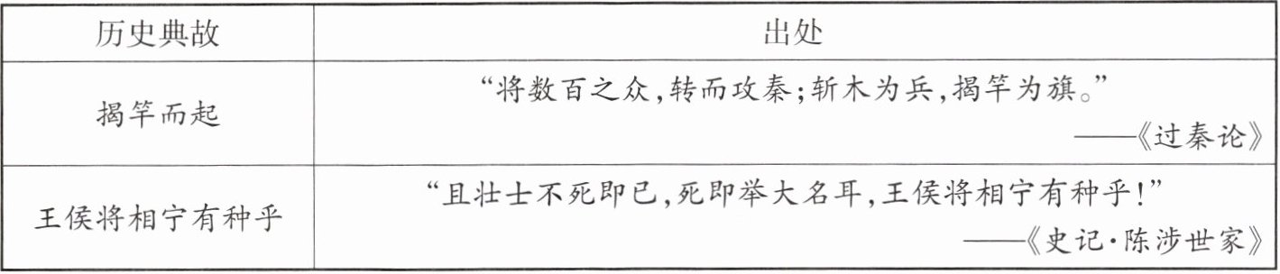 |揭竿而起|“将数百之众,转而攻秦;斩木为兵,揭竿为旗。”——《过秦论》|