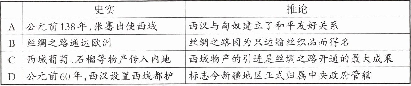 | C | 西域葡萄、石榴等物产传入内地 | 西域物产的引进是丝绸之路开通的最大成果 |