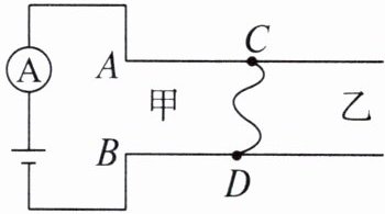 10. 甲、乙两地之间沿直线架设了两条输电线,已知每条输电线每千米的电阻为$0.2\Omega$,现输电线在某处发生了短路,为确定短路位置,检修员在甲地将电流表接入如图所示的电路中,则电压表应接在