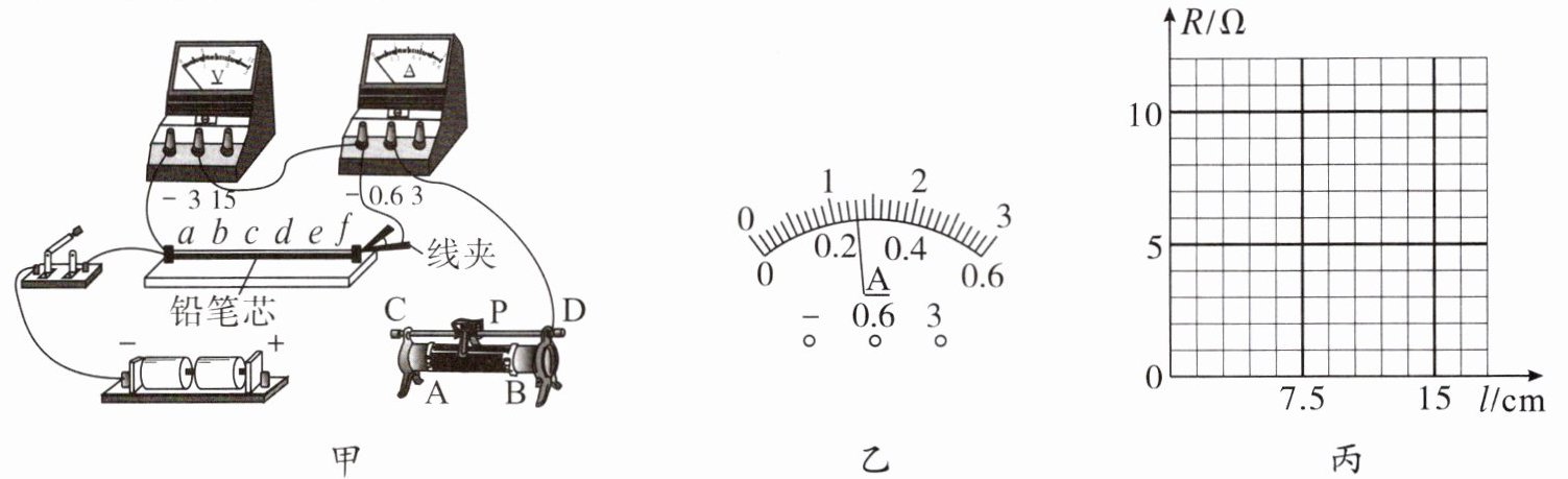 8. (2024·山东济南中考)学习了用伏安法测电阻后,某小组想进一步探究导体的电阻与导体长度的关系。他们选择了如图甲所示的器材,并连接了部分电路。将固定在木板上长为$15cm$的铅笔芯作为研究对象,将其标记为等长的五段,其中$a$、$f$为铅笔芯的两个端点,中间四点分别标记为$b$、$c$、$d$、$e$。