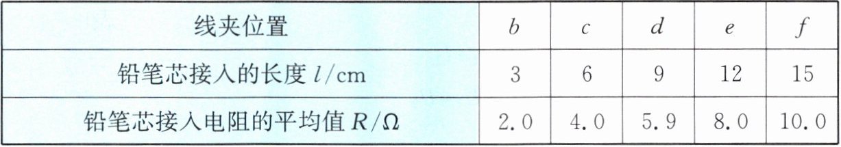 (4)将线夹分别夹在$b$、$c$、$d$、$e$点,重复步骤(3),得到铅笔芯接入的长度$l和对应的铅笔芯接入电阻的平均值R$的数据,如表所示。