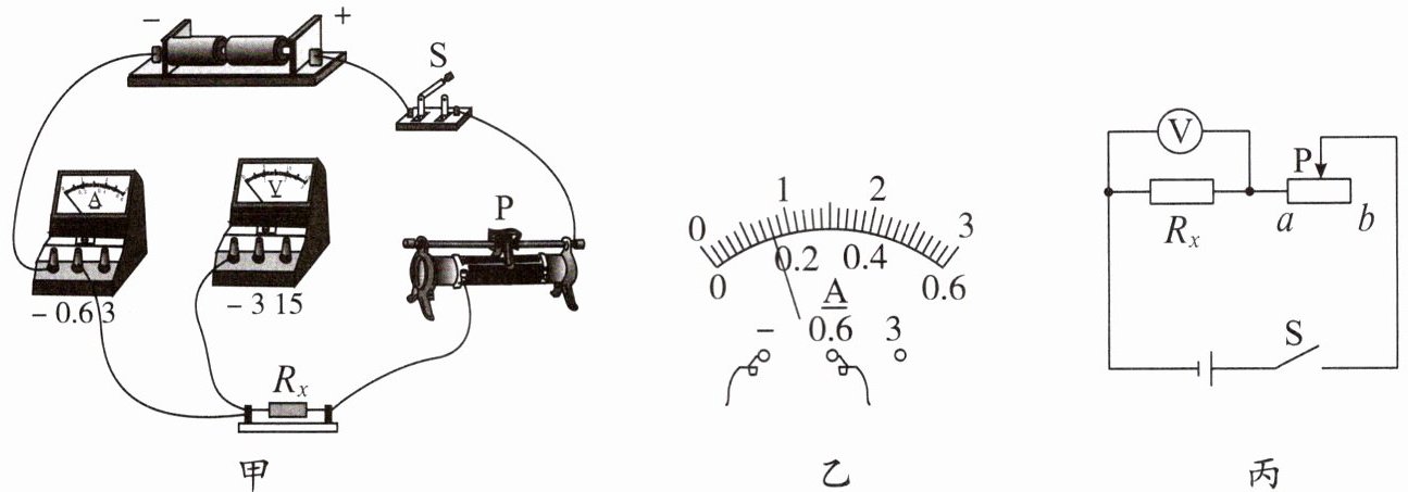 (4) 实验中电流表突然损坏,小组同学经过讨论设计了一种实验方案,也可测出阻值 $ R_x $。电路如图丙所示,电源电压未知且恒定不变,$ a $、$ b $ 为滑动变阻器左右两个端点,滑动变阻器最大阻值为 $ R_{max} $,请把以下测量步骤补充完整。