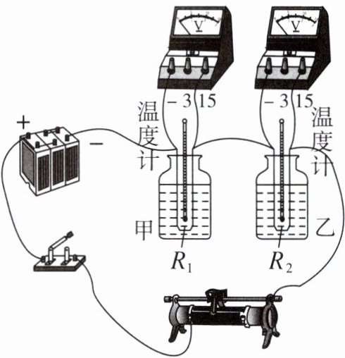 8. 电流做的功跟电压、电流和通电时间三个因素都有关。小明想通过实验验证电功跟电压的关系,选用的器材如图所示。其中甲、乙两玻璃瓶内装有初始温度相同、等质量的煤油,两电阻丝阻值不同($ R_1 > R_2 $)。