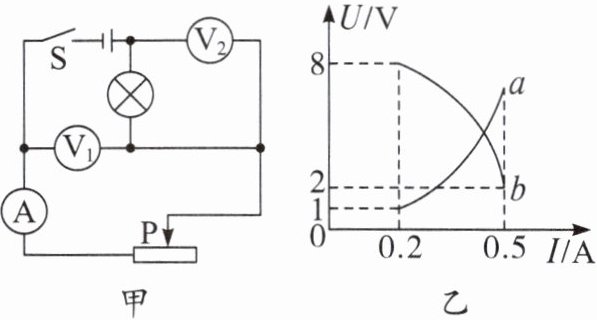 8. (2024·内蒙古中考)如图甲所示的电路中,电源电压恒定,闭合开关$S$,将滑动变阻器的滑片$P$从最右端滑至使灯泡正常发光的位置,两电压表示数与电流表示数变化的关系图像如图乙所示,则下列说法正确的是(