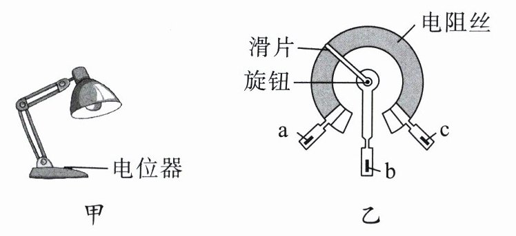 11. 如图所示,甲为亮度可调的台灯,电位器是调节其亮度的装置;乙为电位器的内部结构示意图,$a$、$b$、$c$是它的三个接线柱,旋钮可带动滑片转动。电位器应与灯泡