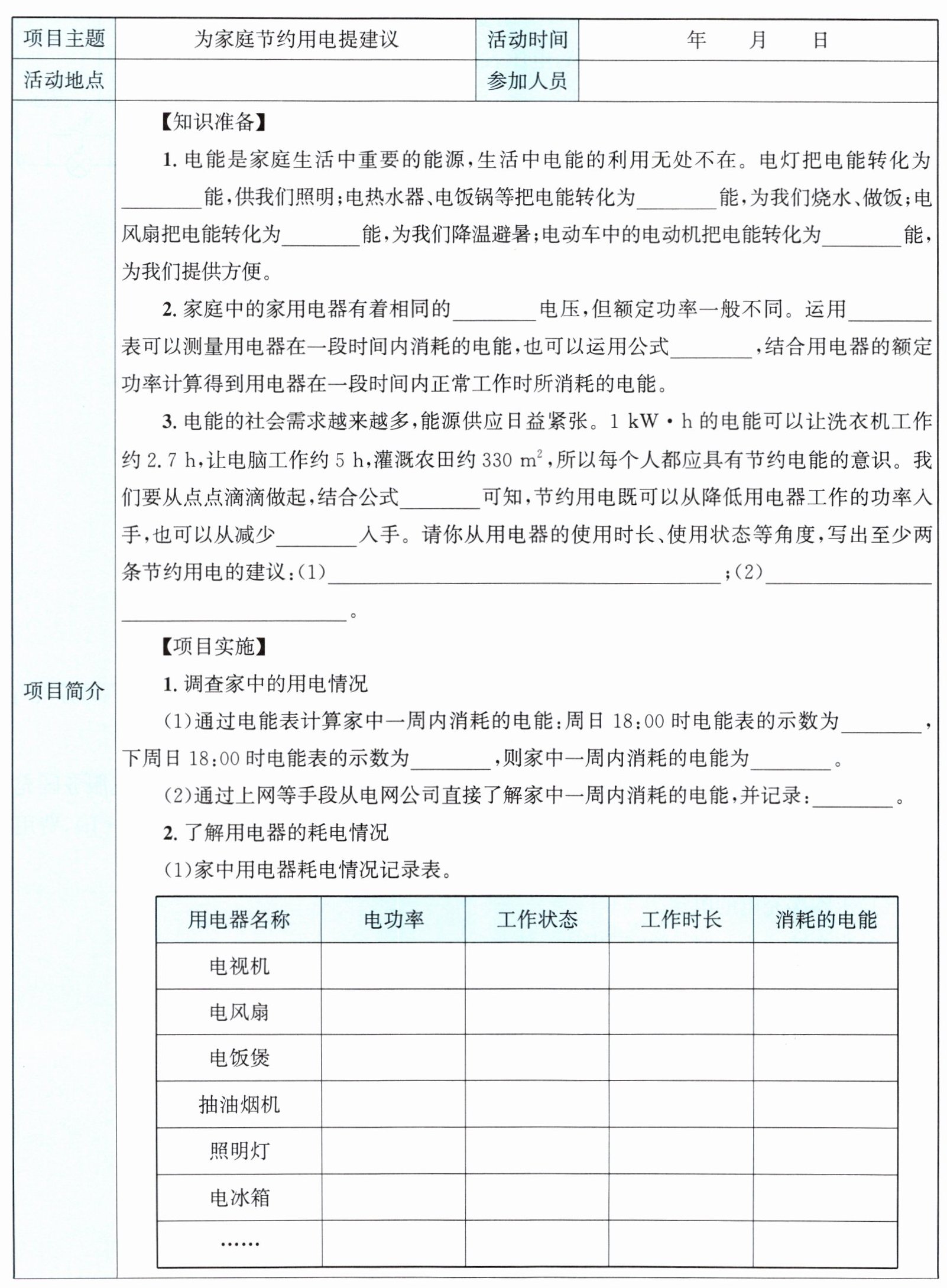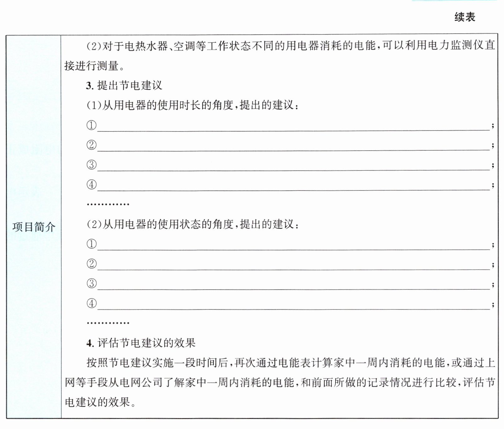 (2)尽量减少热水器、电饭煲等电器的保温时间或减少计算机的待机时间(或降低空调制热温度,提高空调的制冷温度等,答案合理即可) 【项目实施】 1.