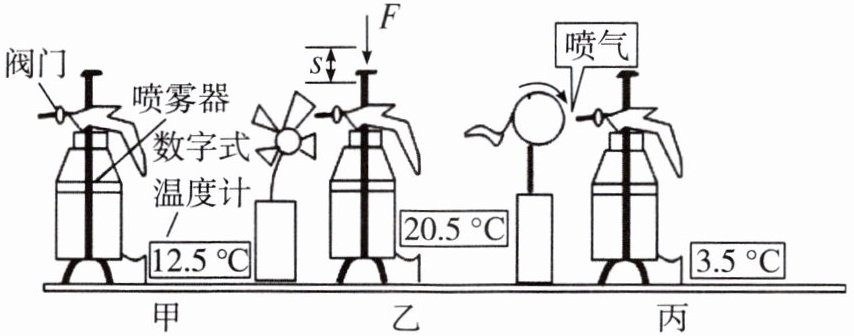 (1)先安装好器材,关闭喷雾器的阀门,用数字温度计测出喷雾器内空气的温度,如图甲所示;手压活塞快速打气,如图乙所示。实验现象: