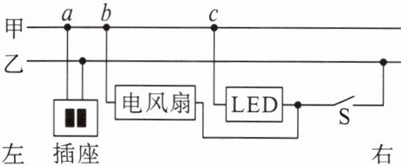 (2024·广东广州中考)如图所示,某家庭电路的输电线甲、乙从右端进户。闭合开关S,LED灯发光、电风扇正常工作,用测电笔检测插座,只有检测右孔时氖管才发光。由于出现故障,电风扇停止工作,LED左灯仍发光,用测电笔检测插座两孔,氖管均发光。该故障是(