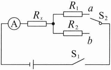 4. 如图所示,定值电阻的阻值分别为$R_1$、$R_2$,电源电压保持不变。当开关$S_1$闭合、$S_2接a$端时,电流表示数为$I$;当开关$S_1$闭合、$S_2接b$端时,电流表示数为$2I$,则未知电阻$R_x$的阻值是(