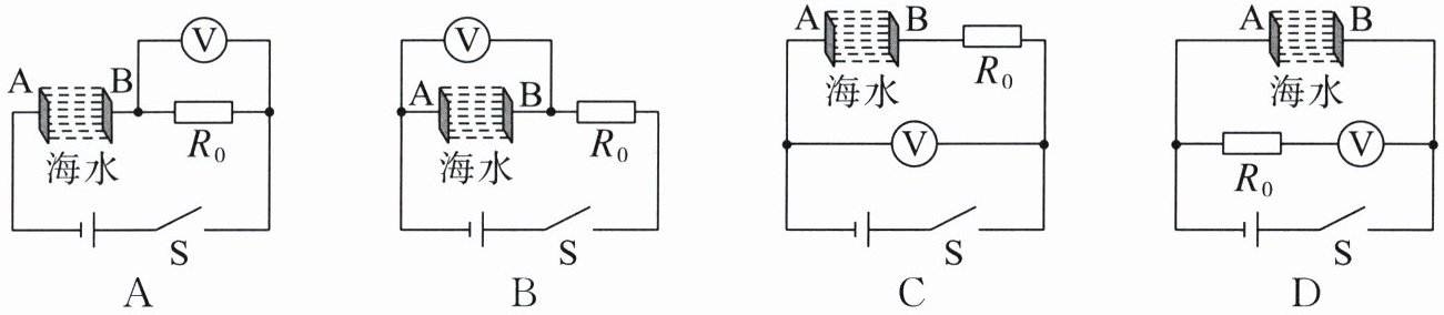 5. 海水中盐的浓度越大,其导电性越好,间距固定的金属片$A$、$B$之间海水的电阻越小。下列电路中,电源电压恒定,定值电阻的阻值为$R_0$,闭合开关$S$,海水中盐的浓度越大,电压表示数越大的是(