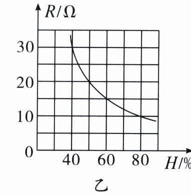 7. (多选)小伟给学校劳动实践基地的蔬菜大棚设计了一个测量空气相对湿度的电路图,如图甲所示。电源电压恒为$6\mathrm{V}$,定值电阻的阻值$R_0为20\Omega$,湿度传感器的阻值$R随空气相对湿度H$的变化关系如图乙所示。下列分析正确的是(