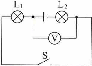 9. 如图所示,电源电压恒为$3\mathrm{V}$。闭合开关$S$,电压表的示数为$0.5\mathrm{V}$,则灯泡$L_2$两端的电压为