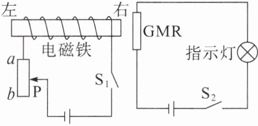 5. 法国科学家阿尔贝·费尔和德国科学家彼得·格林贝格尔由于发现了巨磁电阻(GMR)效应而荣获2007年诺贝尔物理学奖。图中GMR代表巨磁电阻,在磁场中,其阻值随磁场的逐渐增强而减小。闭合开关$S_{1}$、$S_{2}$,下列说法中(