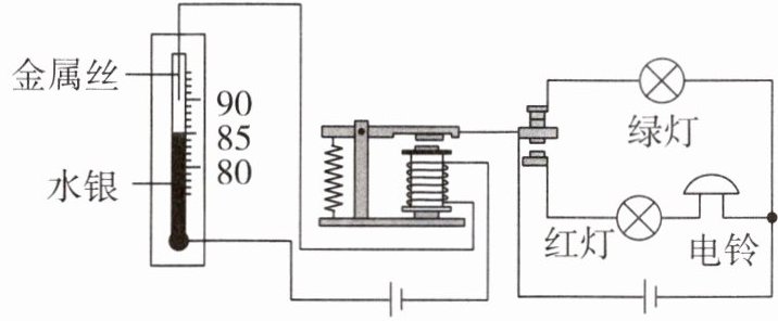 )A.当温度达到$90^{\circ}C$时,报警装置就会响铃,同时红灯亮