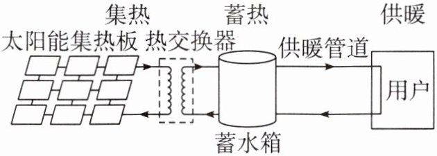 典例分析4(2024·陕西中考)某高校科研人员根据西藏地区太阳辐射强、供暖周期长等特点,为某县设计了太阳能供暖蓄热系统。该系统由集热、蓄热和供暖三部分组成,其基本工作过程如图所示。集热板白天接收太阳辐射时,其内部水温升高,然后通过热交换器,使蓄水箱内水温升高,再通过水泵将热水送至用户。集热板无法供热时,蓄水箱与热交换器之间的阀门关闭。晴天时,集热板获得的内能不仅能满足县城用户全天$24h$的取暖需求,而且富余的内能可储存在蓄水箱中,用以解决阴雨天集热板无法供热的问题,实现“不用煤,不用气,不用电,温暖整个县城千家万户!”
