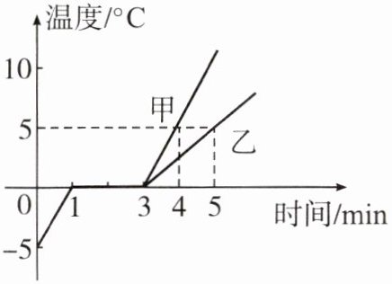 典例分析3 小明用酒精灯对冰块加热,研究冰的熔化现象。他依据实验数据绘制了图中甲、乙两条图线中的一条,已知$m_{冰}= 0.1kg$,$c_{水}= 4.2×10^{3}J/(kg\cdot^{\circ}C)$,$c_{冰}= 2.1×10^{3}J/(kg\cdot^{\circ}C)$,若酒精灯在相同时间内的加热效果相同,则小明绘制的是