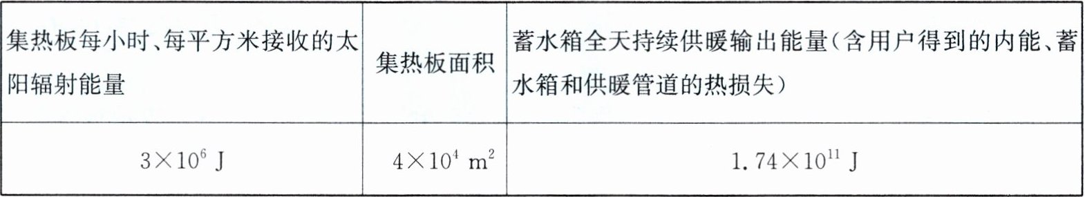 同学们用所学初中物理知识对该系统某一天的数据进行了简单的分析,为便于计算,工作过程和相关数值均做了简化处理,如下表所示。不计集热板到蓄水箱之间的管道、热交换器的热损失。水的比热容为$4.2×10^{3}J/(kg\cdot^{\circ}C)$,水的密度为$1.0×10^{3}kg/m^{3}$。