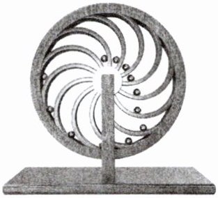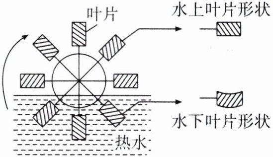 9. 科技馆里有一种“水车”,其结构如图所示,叶片由高分子聚合材料制成,其特点是在常温下,叶片是平直的,在高温下,叶片可向一侧弯曲。当把水车的下半部分放进热水中时,水车就可以转动起来,有人说这种水车是永动机,因为它没有外部动力也能转动,你认为这种说法